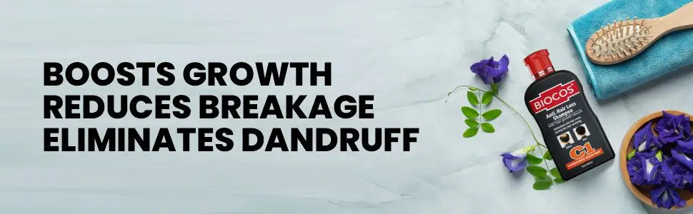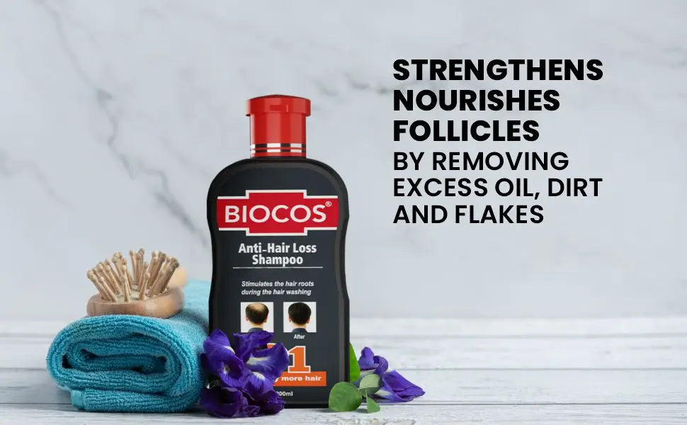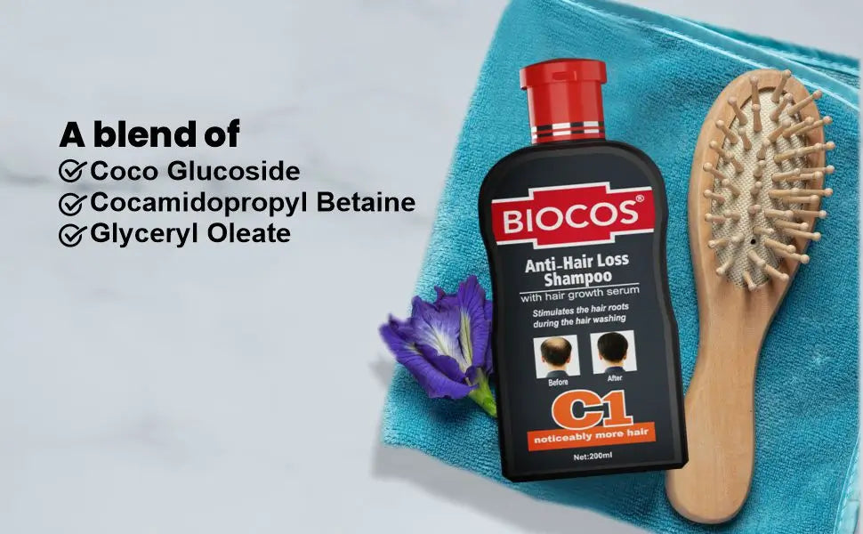 Biocos Anti-Hair Loss Shampoo harnesses Coco Glucoside and Guar Gum to stimulate follicles, fostering thicker, fuller hair growth naturally and effectively.
